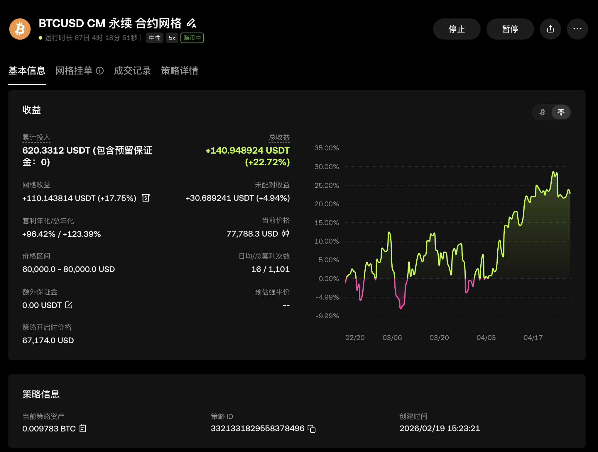 2. 把手里慢慢积累下来的比特币,再拿去跑币本位合约网格