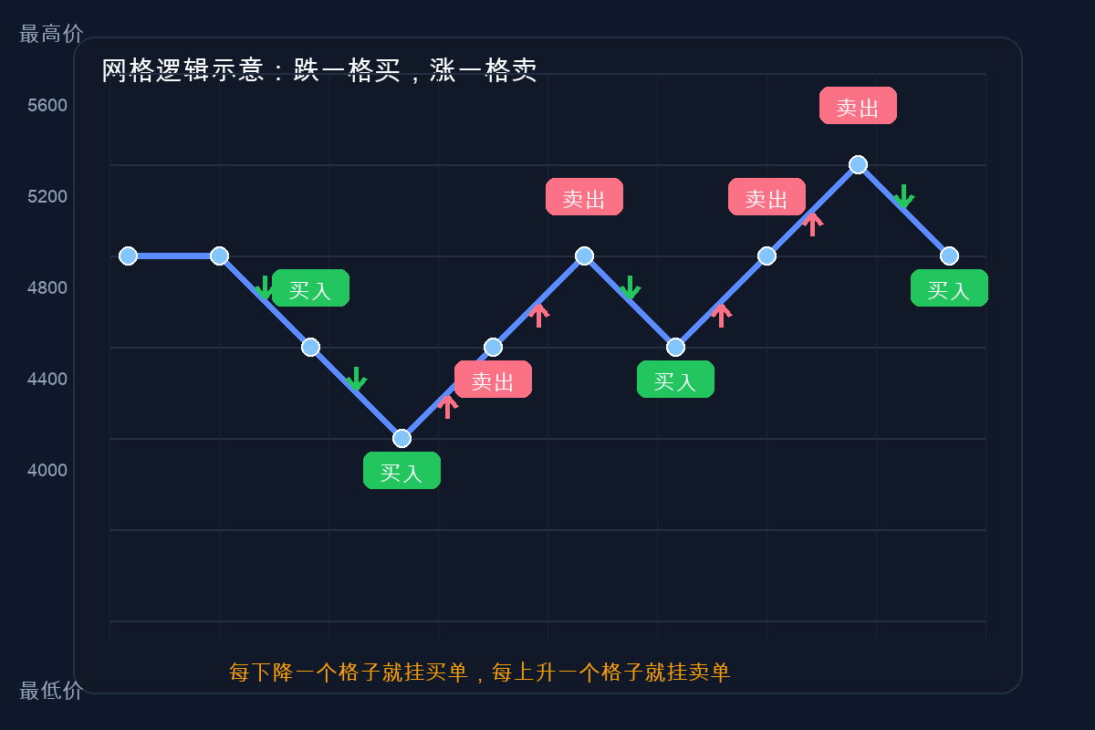 拿你手里的比特币当本金,让系统在价格波动的时候自动低买高卖,慢慢赚差价。