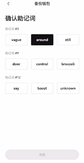 后面会有三个验证,让我选择三个助记词,验证我是否记录正确。